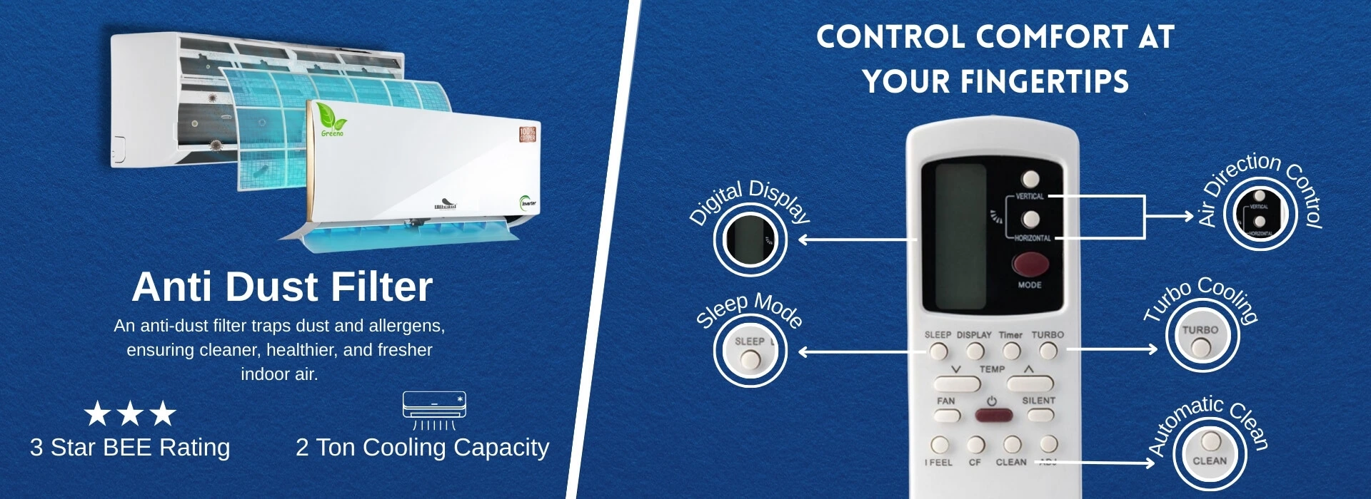 Powerful. Efficient. Reliable. The INDcool 2 Ton 3-Star Inverter Split AC is built to deliver exceptional cooling performance for large spaces while optimizing energy consumption. Equipped with a smart variable-speed inverter compressor, it adjusts cooling power dynamically based on heat load, ensuring consistent comfort without excessive energy use. Designed to perform even in extreme temperatures, this AC offers rapid cooling with Turbo Mode, while its 100% copper condenser enhances durability, efficiency, and low maintenance. The advanced air filtration system, including PM 2.5 filters, ensures that you breathe clean, fresh air, free from dust and allergens. Whether it’s peak summer or humid monsoons, the INDcool 2 Ton 3-Star AC guarantees powerful cooling, smart savings, and long-lasting performance—all in one sleek, eco-friendly package!
