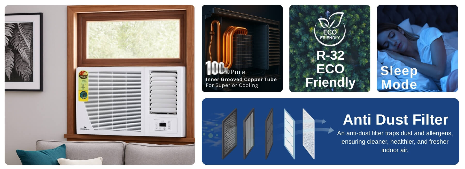 - Condenser Coil: 100% Copper – Faster cooling, low maintenance
