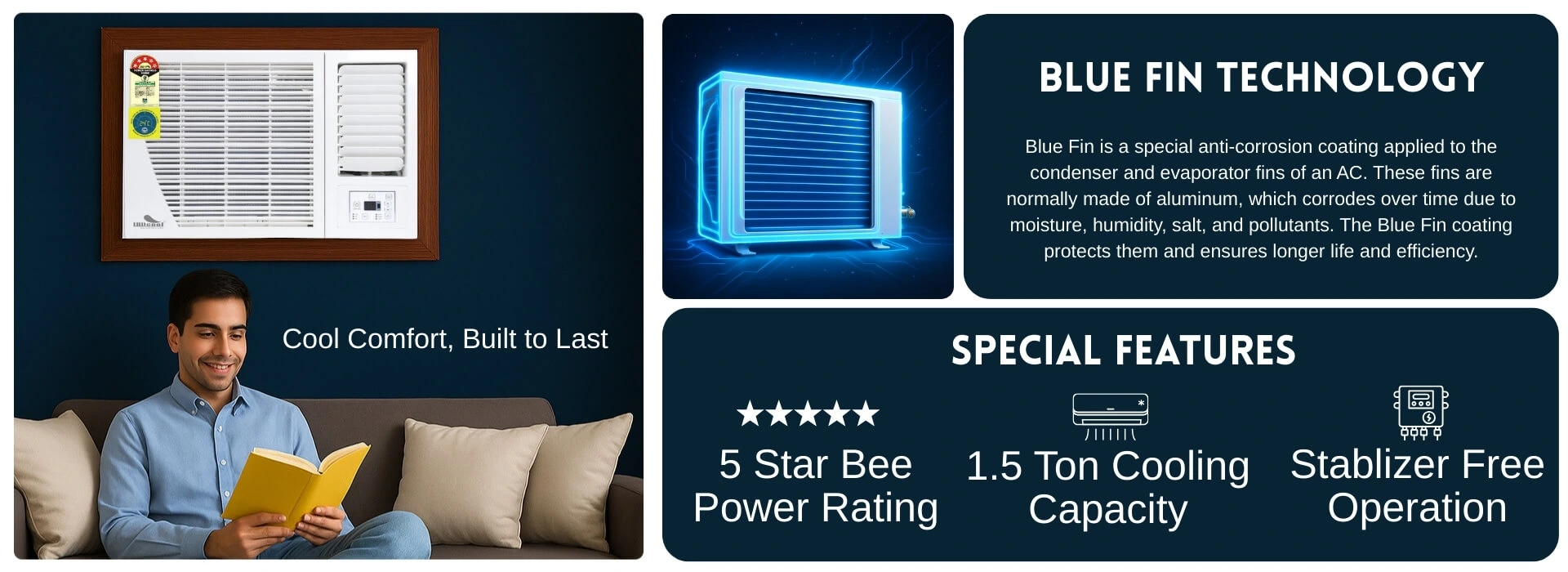 - Condenser Coil: 100% Copper – Faster cooling, low maintenance